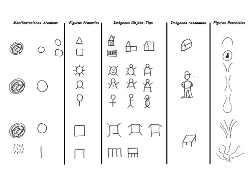 Los objetos-imágenes contienen el trazado que dicta la Memoria Orgánica. El mismo trazado puede estar contenido en distintos objetos: casa, personaje, barco… Como dice Arno Stern en su libro Del dibujo infantil a la semiología de la expresión, “La necesidad que se expresa con él, está unida a su estructura, antes que a la imagen que representa.”.